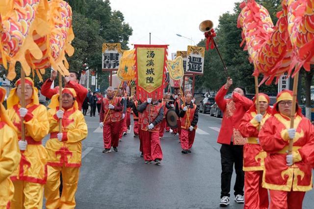 8时,汤溪城隍庙大门开启,开市执行官宣读开市祭文,随着三献酒礼敬天地山河,各代表敬香后,巡游活动正式开始。一时间,长号吹响,鸣锣喧天,鼓乐齐鸣,一黄一红两条布龙在前面开道,城隍花车载着城隍、城隍夫人和财神的尊像缓缓驶出,还有一支四五十人的巡安队作为城隍护卫鸣锣喝道,重现了乾隆版《汤溪县志》中“箫鼓之声腾于郊,逾旬不绝”的盛景。